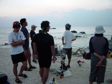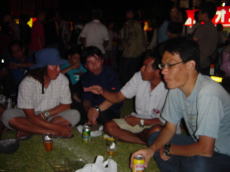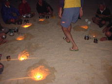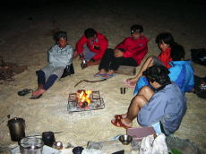 | 夜はひんやりとして、 焚き火の周りに人が集まる。 |