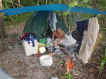平野邸の全貌。システム的にできている。ブルーシートのタープの貼り方は巧みの技でした。 |