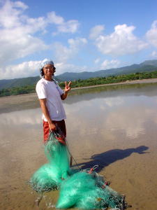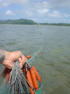 | 岸へ網を引っ張りながら、歩いているところです。 |