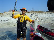 | 渡嘉志久から安室島へ | 安室島の西側で60cmのフエフキダイを 釣り上げて満足そうなカンさん。 |