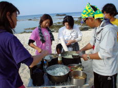 昨晩は阿嘉島のアグにてキャンプ! ここから見ると風裏なので海は静かなの ですが、意外と沖合いは風が強い。 朝食調理中の風景♪ |