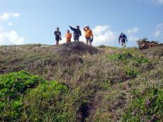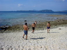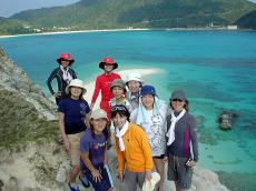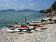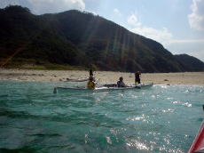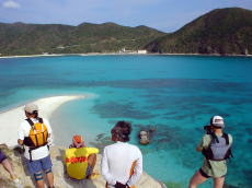 | 慶良間海峡を渡り終えるが、 船酔いでダウン気味の山本さんが 一時陸上にて休憩! |