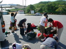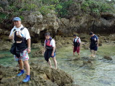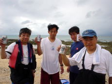 昼食前にビールで乾杯! | 岡波岩から塩崎へ ちょうど雨が小雨になってきた 糸満沖合いです。 |