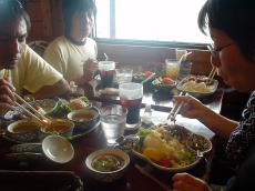 | バンガローで昼食。 2階もあり、ユニットバス、キッチン付き、 TVも冷暖房も。 8人用で一棟20000円。とっても綺麗な バンガローでした。 |
