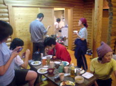 | 朝食はジャンボホットーケーキ! 大人数だから楽しめる料理。 |