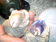 こやつ(左)は絶対、いやたぶんおそらく ヤシガニの子供だね! だってヤドカリ(右)も大きいほうだけど、 やつのはさみは一回りくらい大きく、明らかに足が長い!本当にヤシガニになるのか はっきり見届けたい気分です。 |