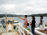 | たかしゅうさんが何かを発見! 式当日にはクルージングができるらしく、 指の先にはカタマランのヨットが〜! すげー!乗りたい!欲しい! |