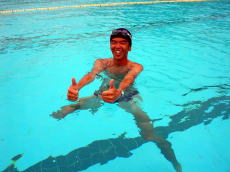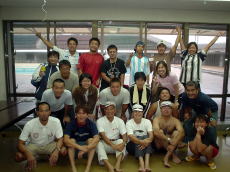 ![]() 立ち泳ぎの練習中の酒井。 手を使わないように体の前に 出さないといけません。 ![]() 講習終了後、 残っていた人達と先生方と 記念撮影!”バディ〜♪” |
