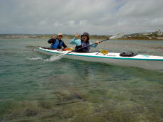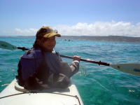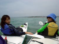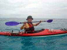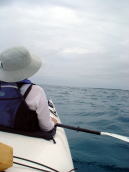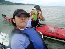 帰りは南西の風が強くて、かなり流されながら、休憩なしで漕ぎ続けました。 ちょうど良いトレーニングになりました。 キヨさんは「こんだけしかお茶飲んで ないよ〜」とアピールしてます。 途中でパドリングを止める余裕がなかったんです〜! |