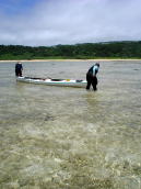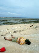 | 海辺観察! 異常に海ヤドカリがいました。 その僕らの横を生まれも育ちも久高島のおばあが、でっかいかごをしょって銛を杖代わりにしながら、沖合いのリーフへ タコ取りに行っていました。 たくましい〜! |