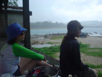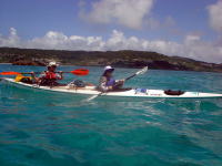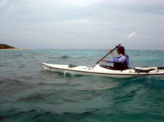 | 今日も南風が強い日でした。ちょうどカヤックを降ろして、海に出ようかという時に大雨が!近くにあるトイレに一時避難しながら、今日初めてシーカヤックをするにしたにさんに屋根の下で軽く講習。30分待つと雨が止んできた!よぉ〜し!行ってみよう!とビーチに出ると、「おやっ?」リーフの内側なのに、満潮と白波が重なり白波が立ち始める!どうしよう=!はるかに昨日の風より強いのである。 「う〜ん(悩)」。緊急ミーティングだ!事情を説明し中止にするか、やるかの相談をして、にしたにさんの「この機会でやらなかった、多分、もうしないかもな〜」の一言でとりあえず行ける所まで行ってみようと決断。志喜屋から奥武島方面へ行ってみる。出発時はものすごい風で陸に寄せられそうになりながら、フェリーグライドで移動。新原ビーチで止めようかと頭をかすめた時あたりから、なんと風がビタっと突然止んで太陽が顔を出す!お〜!やったー!頑張って奥武島まで行ってしまおうー♪ 奥武島に着く頃にはまたもや雨が・・・廃墟の下に隠れて昼食をとりました。14時ごろ、雨があがりそのタイミングで帰り支度。 途中、せっかくだから泳ごうよ!と新原ビーチの沖合いで人間アンカーと僕がなり、カヤックを泳ぎながら引っ張り遊んでると、 隠れてるタコを発見しました。肝心な時に銛セットを持ってきてな〜い。シマッター!でも、せっかく見つけたのにみすみす逃すのも悔しいので、ぺティーナイフと素手で格闘しました。銛があれば速攻で取れるのに、時間がかかるし、タコの吸盤の力を改めて感じました。運が良かったのは、穴の奥がどん詰まりだったので手が届かない所へ逃げられることがありませんでした。そうこう引っ張り押し合いしてる中、手で頭側を探す。頭には吸盤がないからなんとかなるだろう〜と探ってると中指がタコの頭の裏にある袋へスポッと入ると後は簡単に取れました。俺って頭いい・・二ヒヒ♪ もちろん事務所でおいしく頂きました。 |