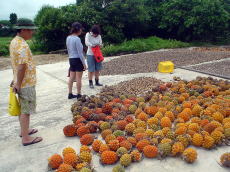アダンの有効活用を発見! 熟したアダンを乾燥させながら細かくして、 チップ件着火材に使うそうです。 久高島では海蛇の燻製作りが盛んです。 公設市場とかで黒くてグルグルまいた あれですよ! |