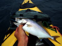 | 大角岩のトンネルをくぐって、小角岩を経由して三重に戻りました。巨大くらげが多く、水死体じゃないかと、はっと何度もビビッてしまいました。 | 黒崎の手前、で80cmのシーラがかかりました。こいつはかなり引いて面白かったですよ、ナイスなファイトを見せてくれました。池島で調達した発泡スチロールに入らずリリース(涙) | カヤックをピックアップに来てくれた宗徳にお土産です。途中休憩したところで潜ると、タコがいました。沖縄のタコより小さいです。 | |