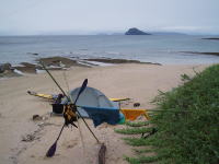 翌日はあいにくの大雨で海は大時化です。おかげでテント内は水浸しです。最悪です。 | |