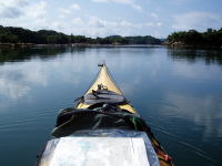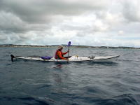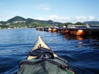 お昼近くに雨が止み、風向きが南から西と変わる。停滞するのはもったいないから、風に乗って九十九島にでも遊びに行こうと決心! 案の定うねりは大きく、調子に乗ってサーフィンしながら、漕いでるとバウ沈をしてしまった〜。九十九島内に入ると先ほどのグチャグチャの海がうその様です。このべた凪なんて幸せなんだ〜♪ |