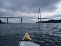 もう10Km先には平戸がありました。うっすら見えています。この後、長崎へと南下する途中、佐世保港の入り口の船の多さにビックリ。渡れるタイミングが難しい、やっぱり航路は気が気でない。 | 長崎側と大島を結ぶ橋。 高速船、タンカー、フェリーが通りました。 |