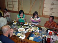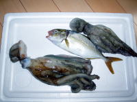 | 安室島にタコはいないと思っていましたけど、運が悪いタコが僕に見つかってしまいました♪出入り口が小さく、中が膨らんでるような所に隠れており、しかも島ぞうりの浮力が邪魔し、ウネリで体が安定せず、捕るのに一苦労! | 夕方、大城が合流し、来る途中にかかった巨大タマンが刺身となりあっという間に胃袋へ!つまみでおなかが一杯。 「ちょっと〜!晩御飯はまだですから〜」 |