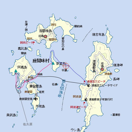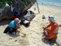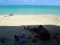 連休は慶良間も混雑気味でした。阿嘉島の南に面した浜は誰もいないのに、今回は3ヶ所ともうまってました。 こんなこと初めてです♪ ちょうどいい所に陰がありました。 |