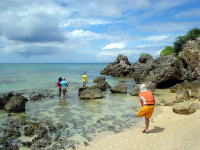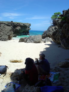 | しったげゆるゆるで新原ビーチを目指す。 | 新原ビーチの岩陰で休憩 | 奥武島の天ぷら屋に立ち寄りました。1個45円が嬉しい。月曜日だというのに、混んでいて15分も待ってようやく買うことができました。 | |