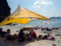 お昼頃安室島に到着! | 昼食を済ませて、日差しが強くてなかなか外へ動こうとしない(笑)地球が回るにつれて、僕らも後ろへジリジリ移動です。 | |