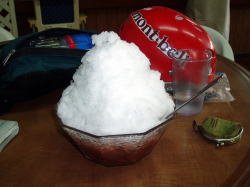 | 那覇のかめかめそばの近くにある「千日」のぜんざいです。 氷のキメが細かく、口の中でファっと消えてしまいます。 量が半端じゃな〜い!ヒマラヤ山脈並みです(笑) 地元のお客さんが多く、いつも混んでるから、やはりおいしいのだろう♪ |
