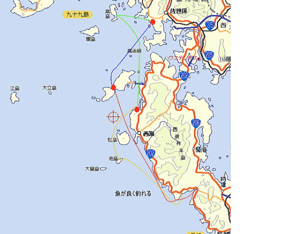 左が崎戸、右が大島。 長崎側から一番西へ五島に近いところで海の様子を見ることにしました。 |