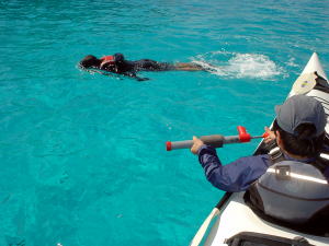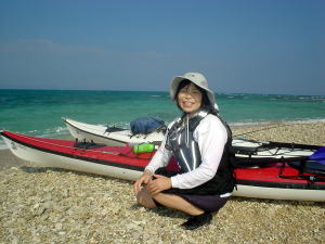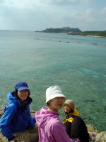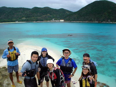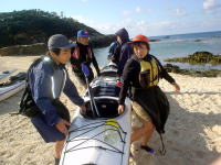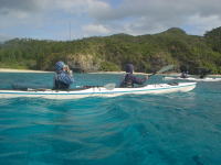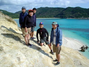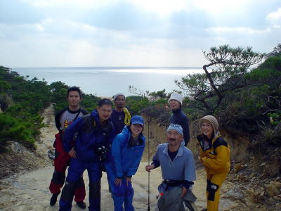 | 関西からの参加者江上さん:今回は大城と二人での1DAY ツアー 当初は13日14日と1DAY ツアー2日間予定でしたが 13日は大時化の為中止、14日は打って変わって日昼の気温が24℃と 日焼けするぐらいの良い天気「江上さん日焼けは大丈夫ですか?」 |