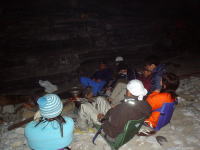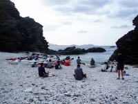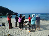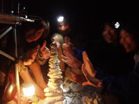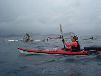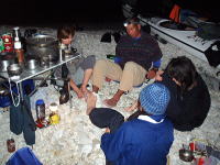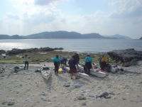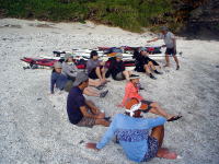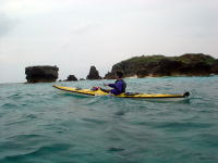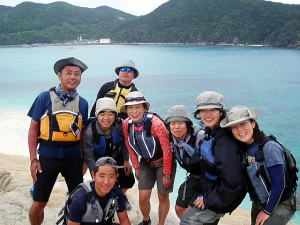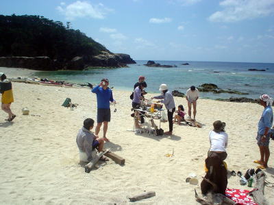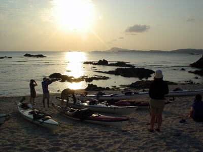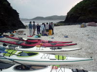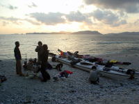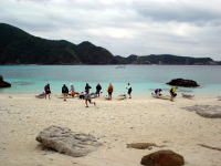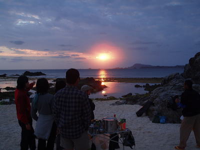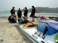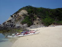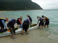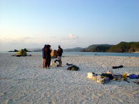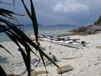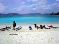 | 焚き火を囲んで温まる | 安室島を出発。またクジラがいないか水平線についつい目がいき、キョロキョロするもんだから首が・・ | ナゼ(慶良間海峡の真ん中)で途中参加のまりさんと合流し、渡嘉敷へ。買出しの為、上陸するところ。 |