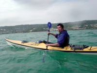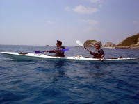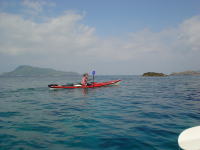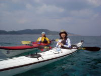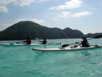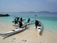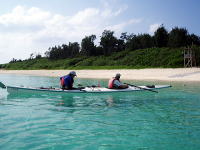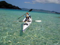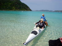 | 渡嘉志久ビーチで昼食中に沖合いで鯨のジャンプが見れました。あの水しぶきは凄い! | ナノックの新しいタンデム艇の進水式。 初めて慶良間の海に浮かべられる。 積載量がかなりあって、僕らガイドにとっては願っても無いカヤックである♪ |