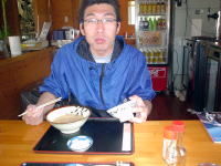 | 予測通り、16:00発のフェリーが13:00発にくり上げ運行が8:00に判断され、早めに撤収出発し無事に渡嘉志久ビーチへ戻る。途中で海亀も見れたしね〜♪ | お昼は那覇の「じゅね」という八重山そば屋でいただきました。泊港のすぐ横です。 美味しかったですよ! |