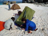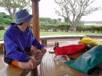 | ムカラクの丘の上から、クジラを探してみましたが、ウォッチング船の陰も無く、べた凪なのにブローも見えない。本当にこればっかしは運ですね。 | テントを建てようとすると、 「ポールがない!!!」 竹やパドルを使って、骨組みを作りなんとか設営することができました。 なかなかの出来です! |