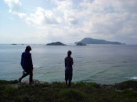 シブガキ島に到着、これから山に這い上がって鯨を探す。残念ながら鯨の影無し・・・ | 翌日、停滞して沖合いにウォッチング船が集まりだす。これは出るしかな〜い!慶良間海峡の中央付近で待機するが、鯨は南の方へ行ってしまいました。船酔い者続出〜♪ |