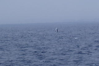 | 慶良間海峡南側でウォッチング船を発見! 私この前のリベンジを晴らしたく、近づいたのですが、鯨もどんどん南下してしまいました。 しかし、カヤックから何度も鯨を目撃し、漂ってると突然奥平艇の横に出てきたのにはビックリ!ブローの音も聞こえたので、そこそこの距離でした。 |
