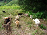 | 座間味の東端の浜です。夏は亀の産卵が見られる浜です。海を見ては出れるかな〜と判断が難しい状況でした。 | なぜか突然野良猫の集団が! 猫って単独行動が多いのに?なぜ?ゆうに20匹以上はいました。ニャンニャンハウス真っ青の数♪でも悲しいことですね・・・ |