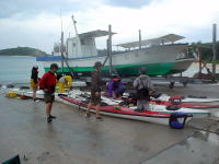 | 最終日、なんだか雲行きが・・・ カジマーイの雰囲気、南風から急に北向けの風に急変することを沖縄ではいい、海が時化ることです。 朝食もせずに、起きるとすぐにテントを撤収する。大城艇だけ渡嘉志久まで戻り、後は阿波連の港に避難しました。雨です(涙) |