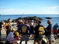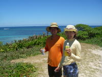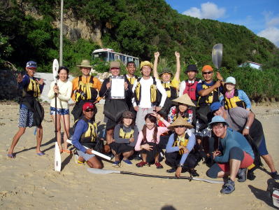 ![]() 無事に約24kmを漕いで、伊是名の手前の屋那覇島(11:50)に到着!所要時間約4時間30分 名物!オリオンビールラッコ飲みスペシャルを皆で披露♪ |