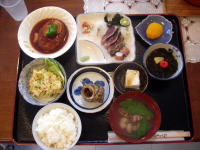 | 民宿の近くにあった重要文化財の「銘刈家」です。時が止まってるようにたたずんでいました。 | 宿の夕食! 豪勢です♪作らなくっていいってステキ! |