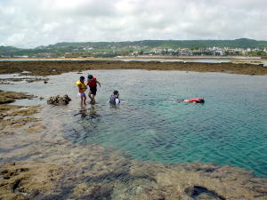 | 奥武島の沖合いにある、干潮の時に出てくるポイントです。時間をまちがえると、危険なポイントですが、 今日は完璧のタイミングです。泳ぐぜ〜!あ〜いくら泳いでもちっとも寒くないってすばらしい♪ 沖合いは台風のウネリがまだ残っていました。 |