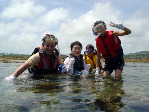 | リーフが出てきて、陸地まで遠いよ〜。 潮待ちのため、アンカーを打って、海が満ちてくるまでシュノーケリングを楽しみました。向こうに見えるのは屋嘉比島です。 |
