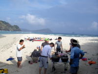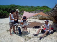 | 阿嘉島を反時計周りして、渡嘉敷を目指す。ヒヤルガに到着してすぐにお昼ご飯。夏は冷たいサラダパスタが簡単だし美味い♪ | わずかな陰に入り、食事と休憩! この後は自由行動! シュノーケリング、お昼寝・・・ 楽しみ方はいろいろ♪ |