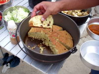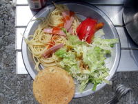 | 朝飯!昨晩は暑くて暑くてテントでなんか寝られない状態。外で寝てたり、雨が落ちるとテントに戻ったりと忙しい夜でした。 朝起きると、みんな外で寝てるのには笑えた。 |