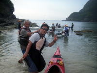 あっという間に潮が満ちてきて、カヤックを引っ張り、陸上に到着! 大潮だったからシュノーケリング中も流れがありました。 まずは!まずは!とクーラーBOXに手が伸びる♪ |