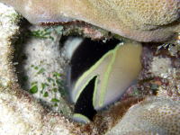 | 隠れてるつもりなんだろうか・・・ 頭だけ突っ込んでる「モンガラカワハギ」 を発見♪頭隠して尻隠さず・・・ 自分を見てるようで♪ |