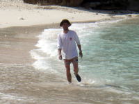 | 最後の渡嘉志久ビーチで海の上でビールをいただいております。プカプカ漂いながら、なんの心配も無く、 目の前のビーチに帰るだけだから緊張感もゆるんできます。 |