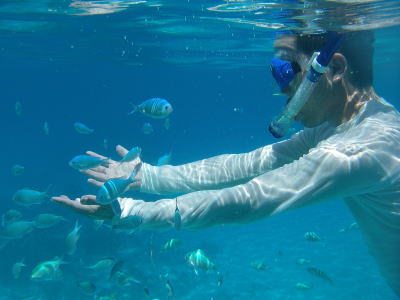 | 朝のパンの残りをあげたら魚がたくさんです。 | どうだ!かゆんだぞ!と言わんばかりに愛しきムヒを突き出す男達(笑) | |