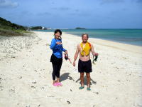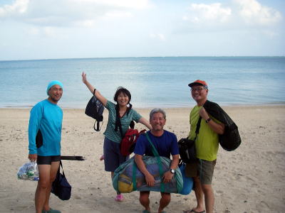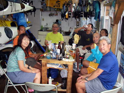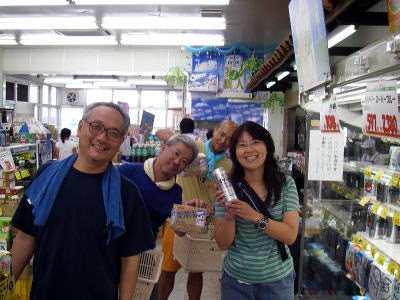さて台風が過ぎ去った17(日)。朝早く細川さんから電話がなる。「みんなね〜海でビールが飲みたいのね〜そしてちょっとでいいから海に入りたいんだよね〜」ようはどっか連れてってことで。南部にある百名ビーチへ。ここならリーフも遠いし特に影響がないのです。 奥武島近くのAコープでビールの買出し、お昼どうする?なんくるないさ〜! |