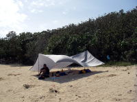 | 細川さん自慢の紫外線99%カットの特注タープ。タープを見るとわかりますが、今日も風はまだまだ残っていました。 | ||