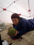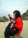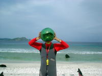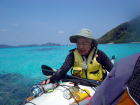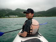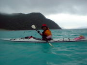 3日目。クジラを探しに行ったものの「飛んだっ!!!」 と思ったら1,5キロ先。 「あっ、ウォッチング船が南に向かってる!」 と思ったら、また1,5キロ先。。。 さっき、そこ通ったのに〜(泣) 追いかけるのをあきらめて せっかく晴れてきたのでカヤックでのんびりビールを飲むことにしました♪ |