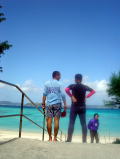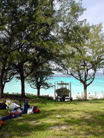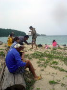 飲みながら、ヤギの群れを見ています。 「イチ、ニイ・・・みんなで11匹もいるよ」 「捕まえよう!」 「元気が出るよ!!」 「あ、まだ集まってる。子ヤギもいる。奴なら・・・」 と言いつつ、浜に下りてくるまで機会を伺う大人たち。 手にはしっかりとそれぞれのお酒が握られています。 |