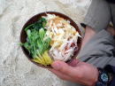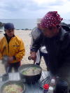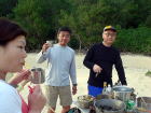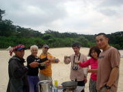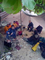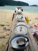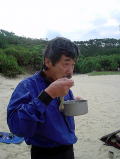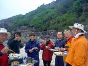 2日目は停滞。 漁船も湾の中に避難してきていました。 海に漕ぎ出せないとわかったみなさん、手に持つものはもちろんマイカップ。はいっているのはもちろん島酒。 お昼から焚き火のそばで”無人島では何が食べられるのか”談義。 モンパの木の葉っぱはキャベツみたいでおいしそう!とおっしゃるので食べてみたら あんまり味がしませんでした。 |